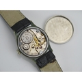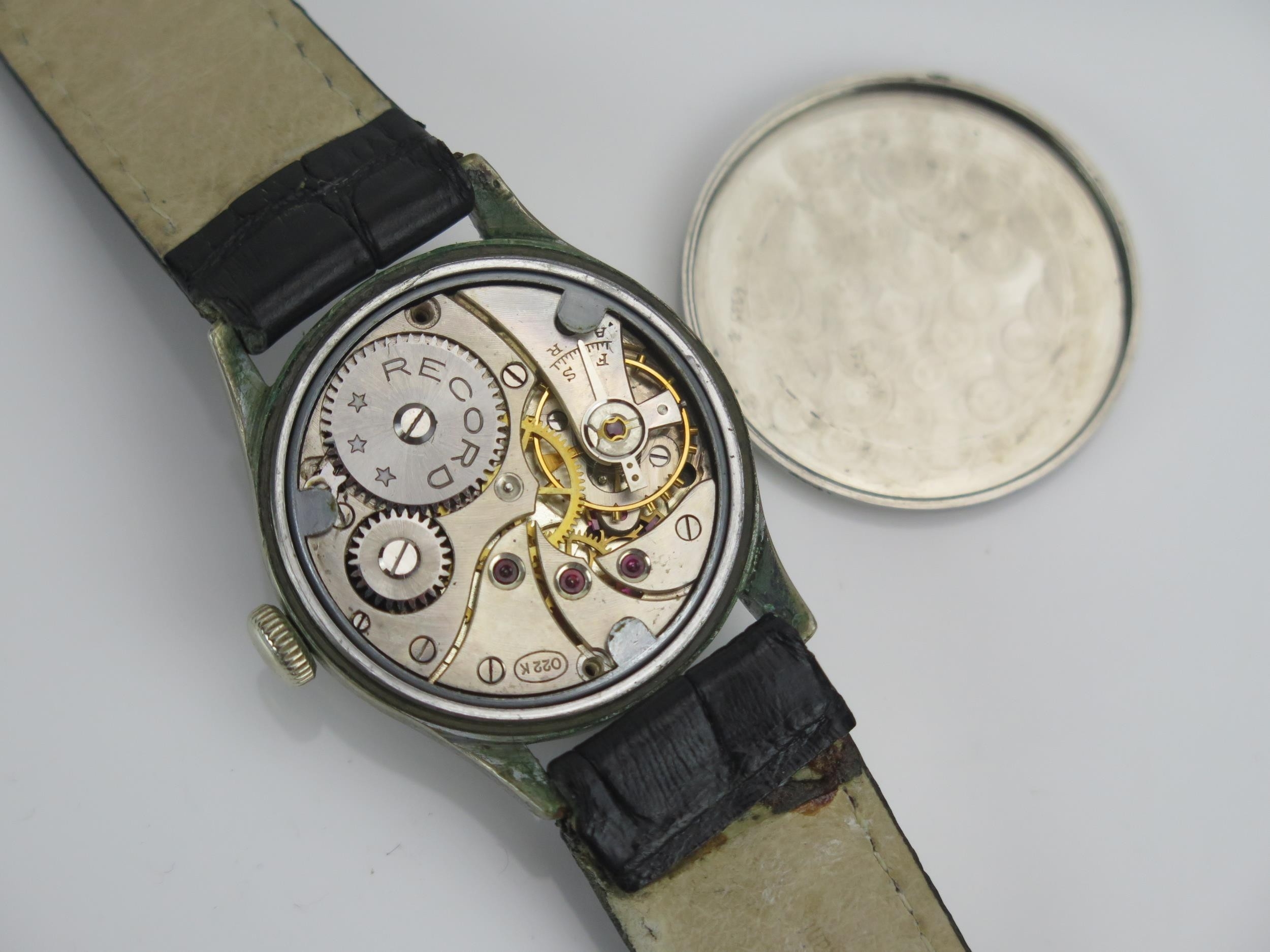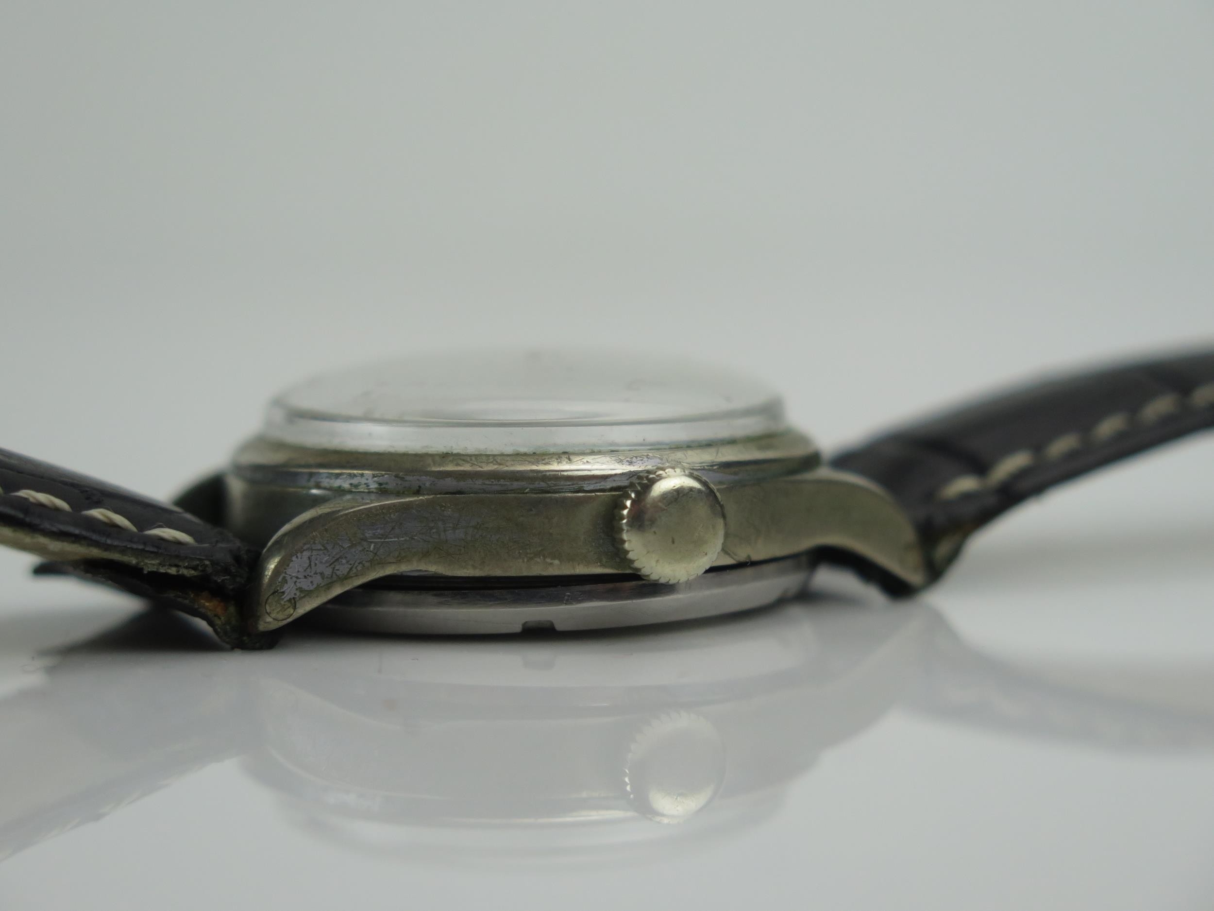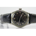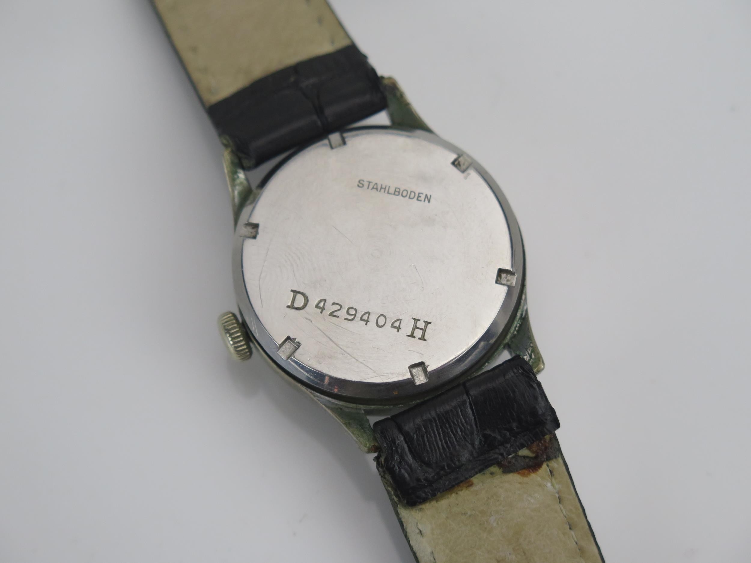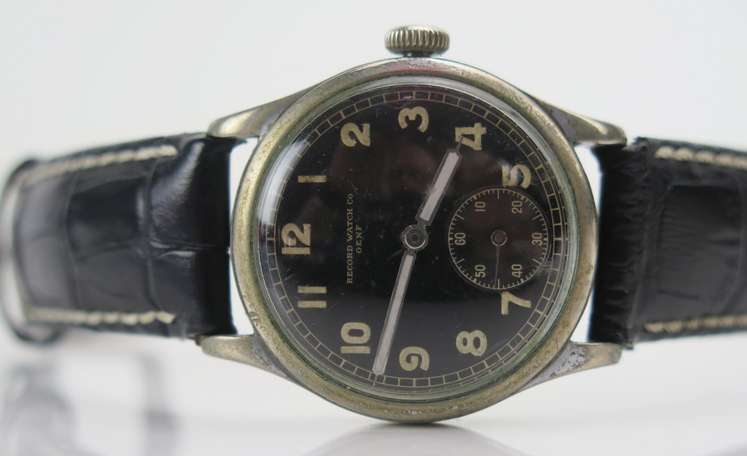 WWII RECORD WATCH Co., GENF German Military Manual Wind Wristwatch, the 33.7mm stainless steel case with black dial, back marked D 429404 H, Record caliber 022K movement. Winds & runs