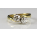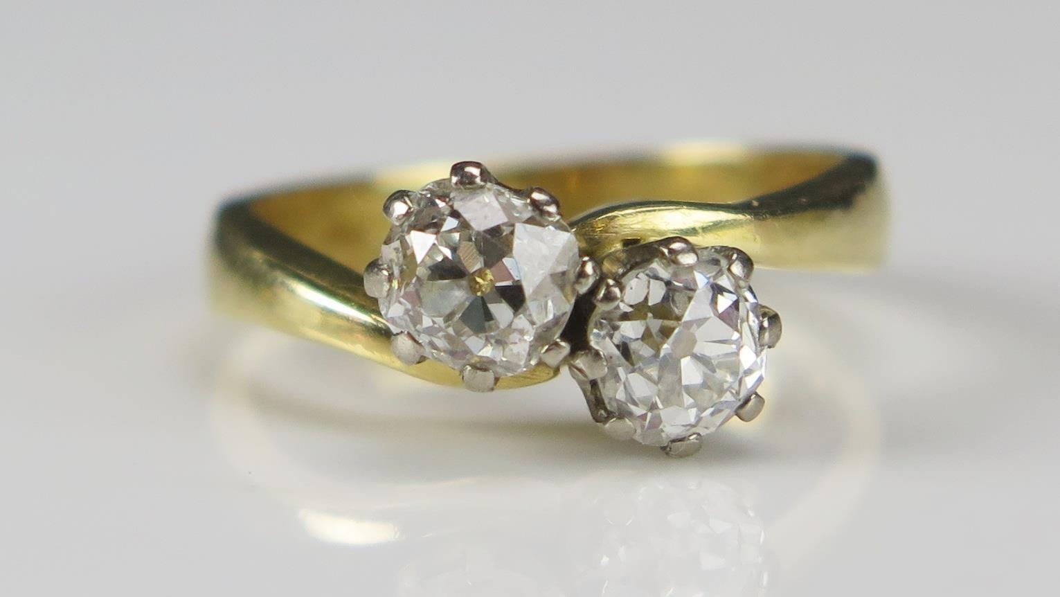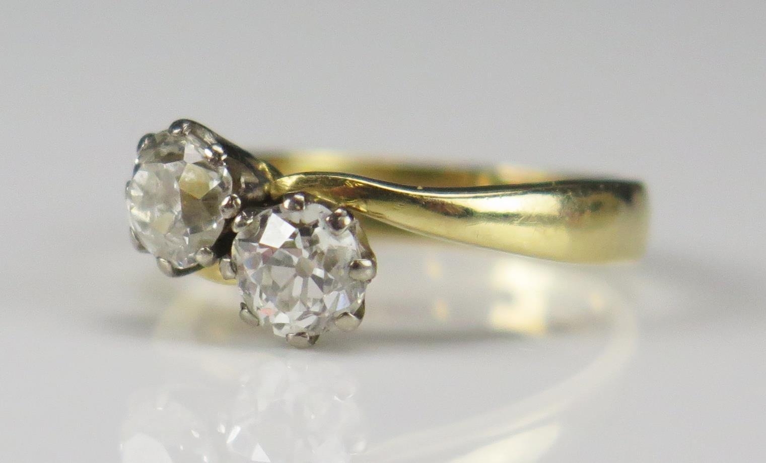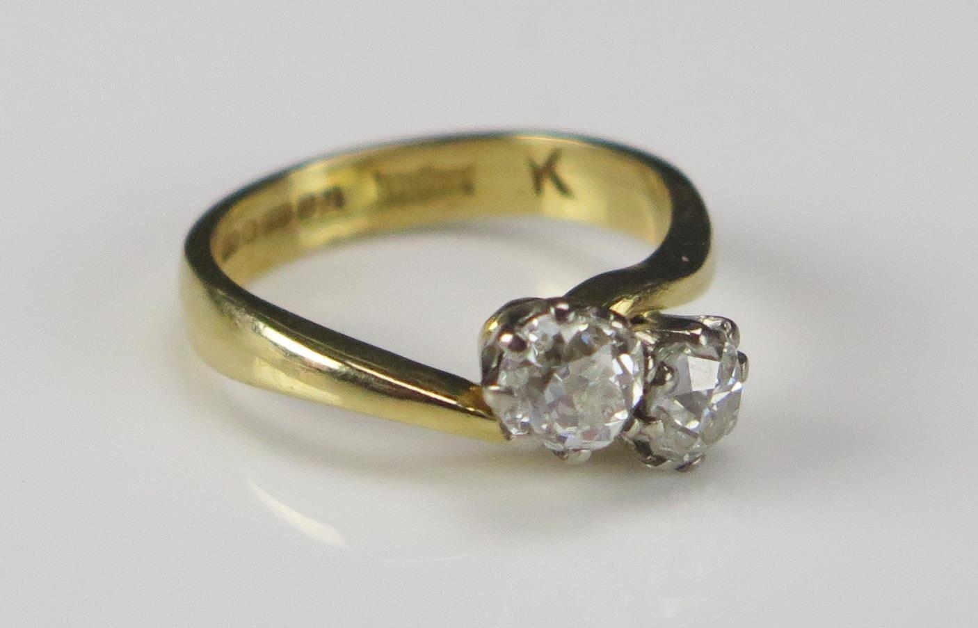 An 18ct Gold and Old Cut Diamond Two Stone Crossover Ring, size H.25, hallmarked c. 4.6-5mm stones, 3.47g