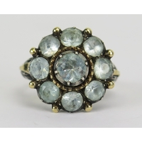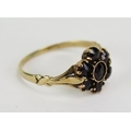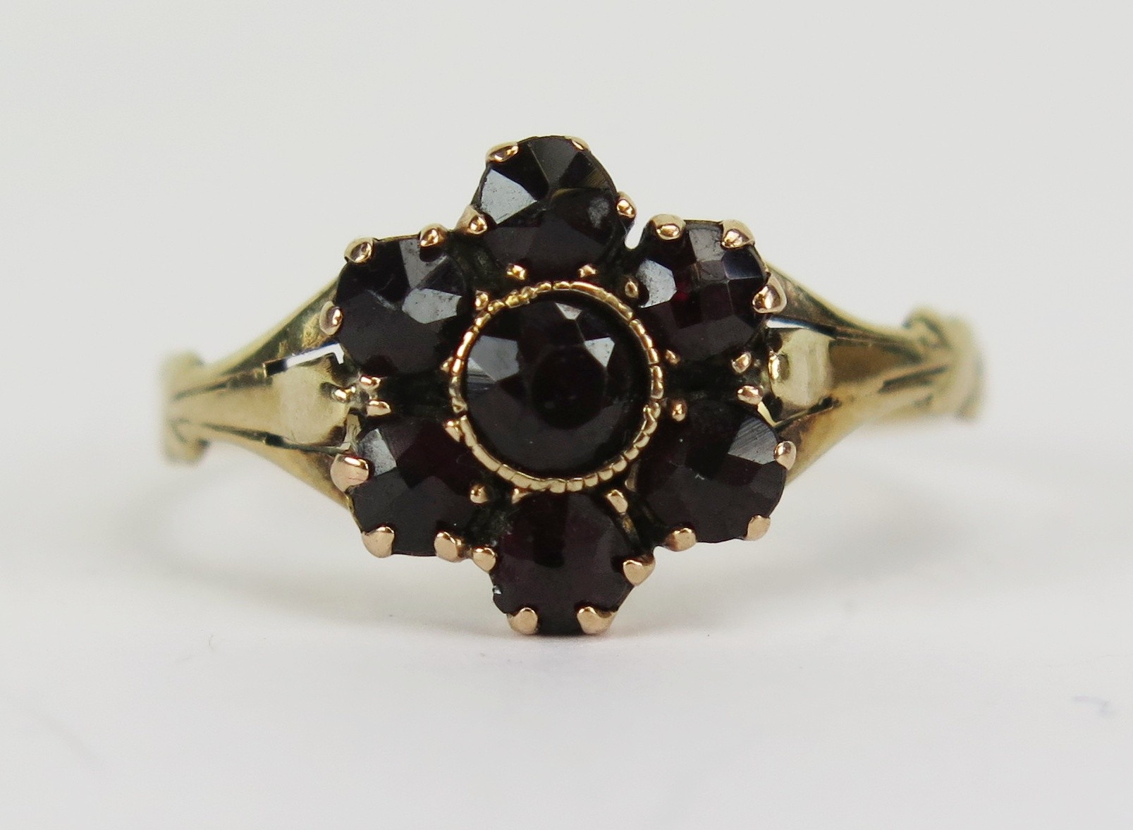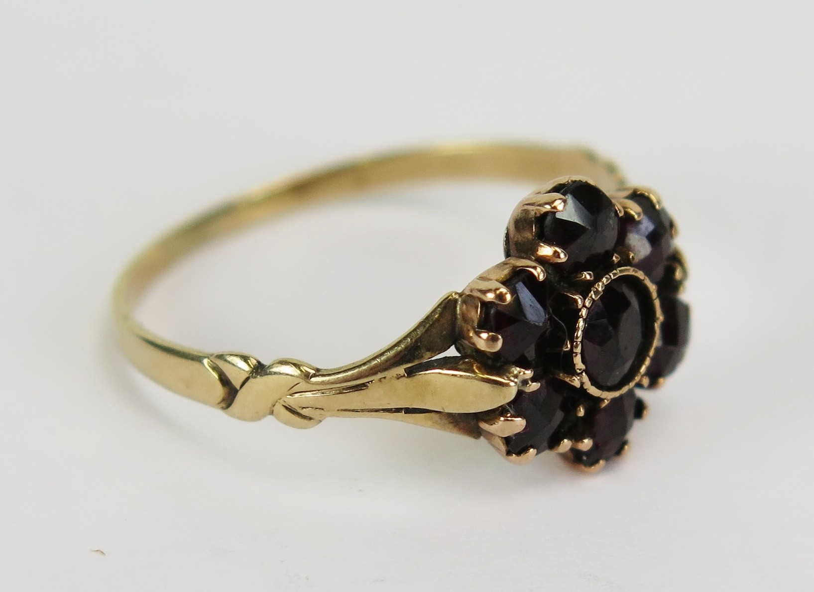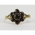 Victorian foil back garnet cluster ring in a precious yellow metal setting, size J.25, KEE tests as 9 carat, 1.38g. UNLESS OTHERWISE STATED, THE KEE TEST IS A SURFACE TEST ONLY AND IS NOT A GUARANTEE OF GOLD PURITY.