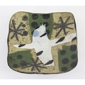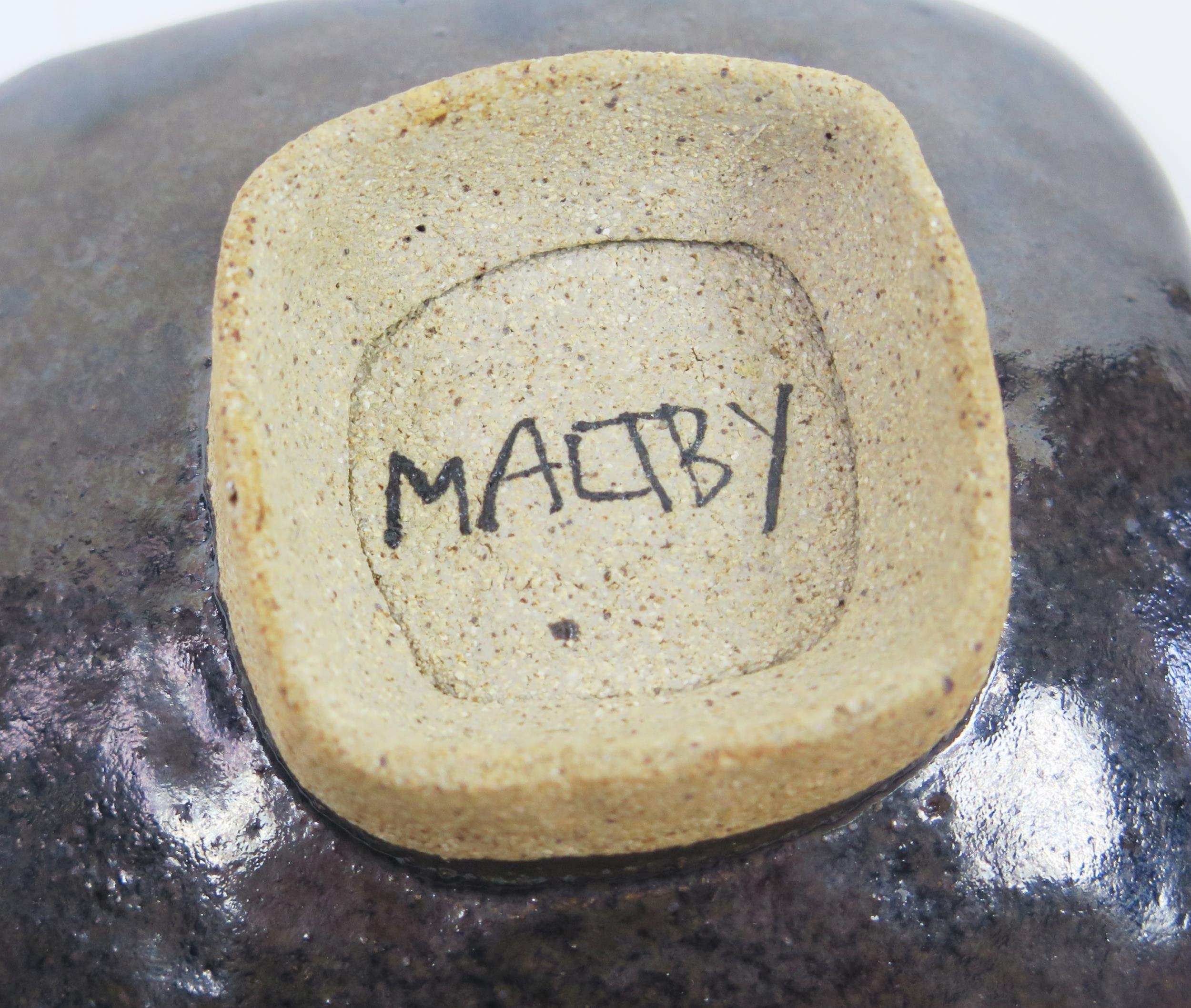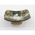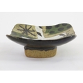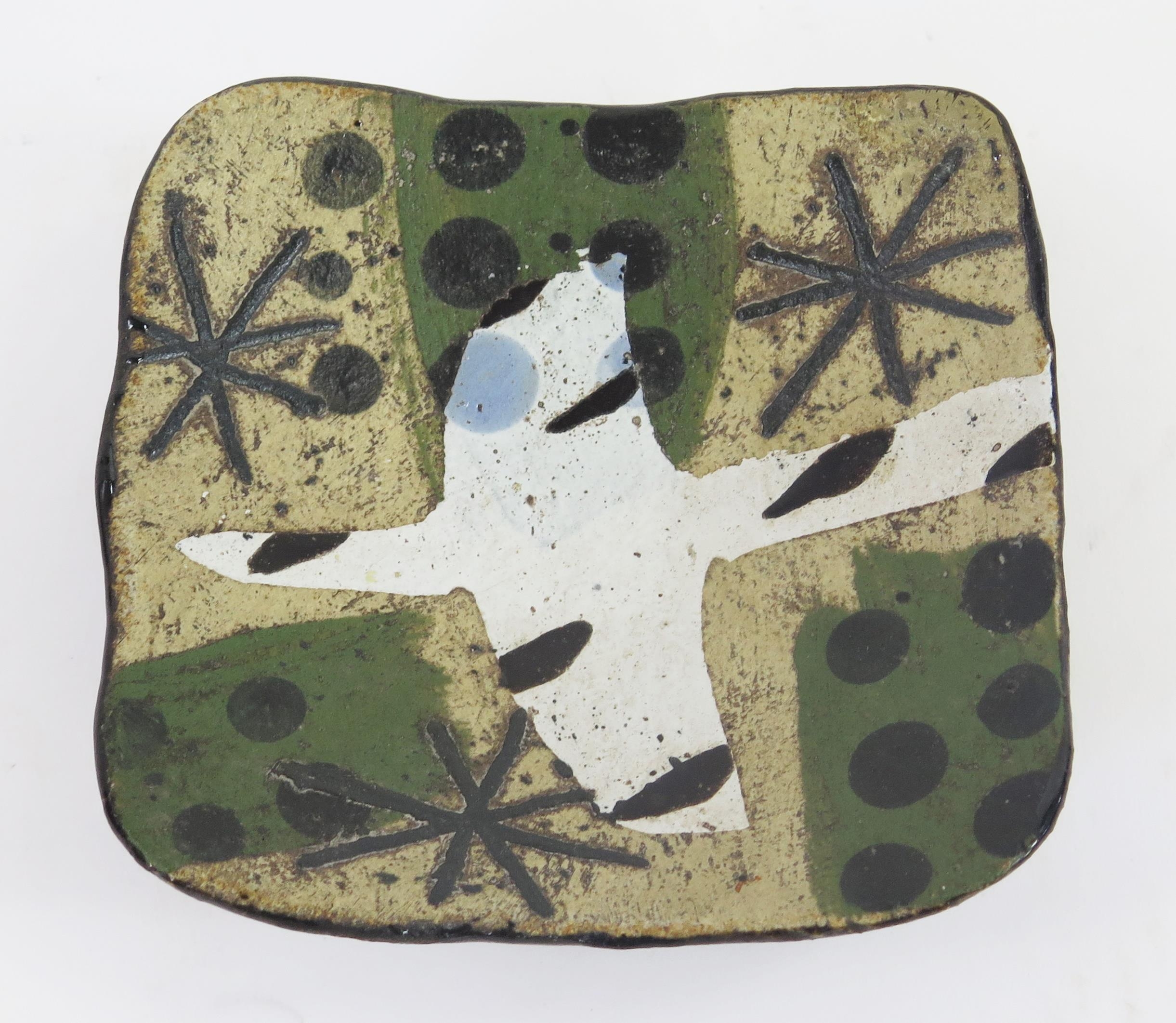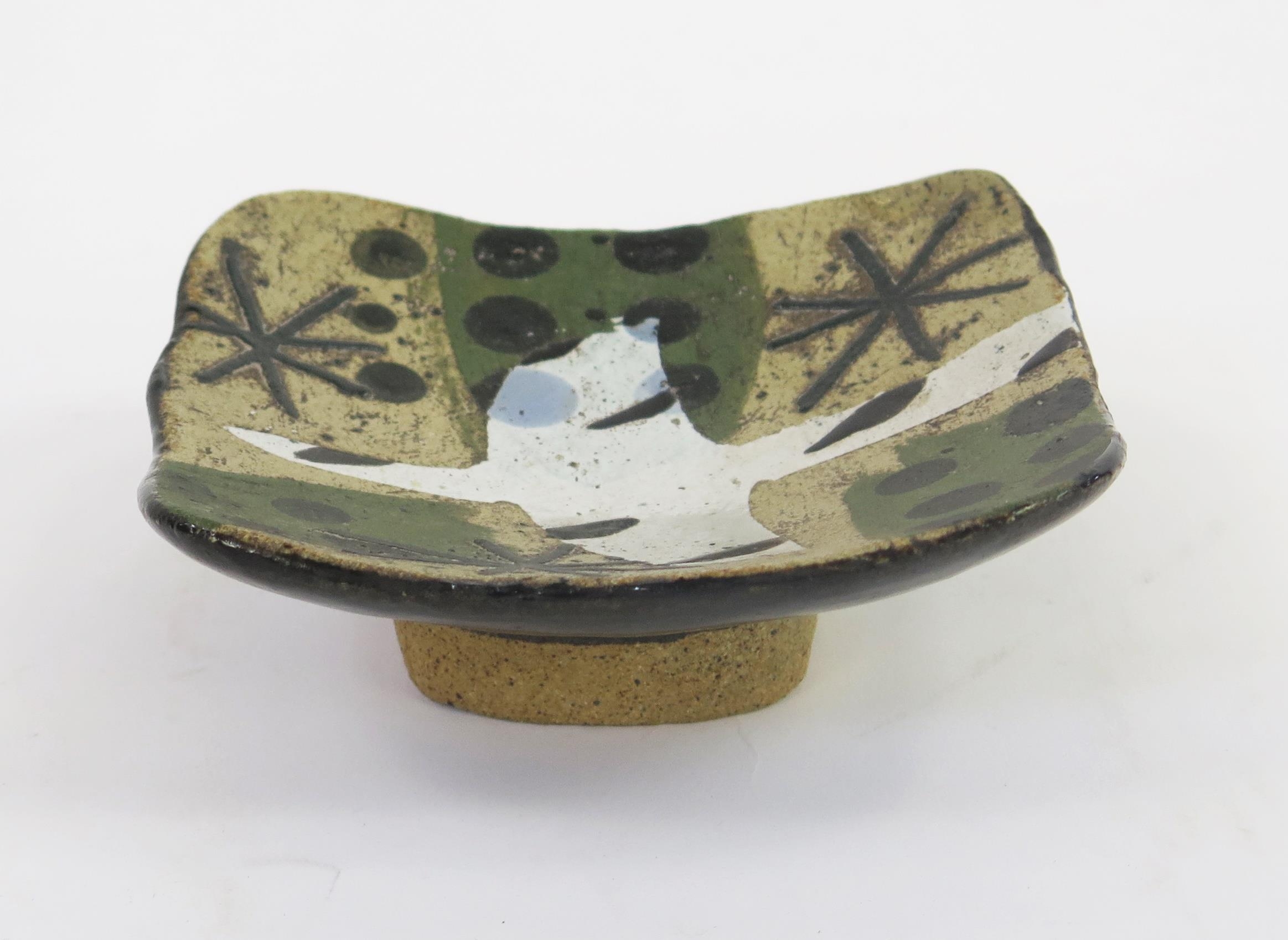 JOHN MALTBY (1936-2020) A small studio pottery dish with abstract stellar, dot and bird design, signed to the base, 12cm wide.