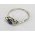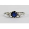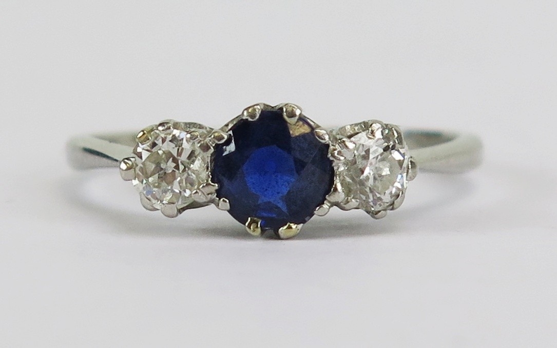 Precious white metal sapphire and diamond three stone ring, c. 4.8mm principal stone with 3mm diamonds, size L, faint marks, KEE tests as platinum, 2.24g. UNLESS OTHERWISE STATED, THE KEE TEST IS A SURFACE TEST ONLY AND IS NOT A GUARANTEE OF GOLD PURITY.