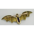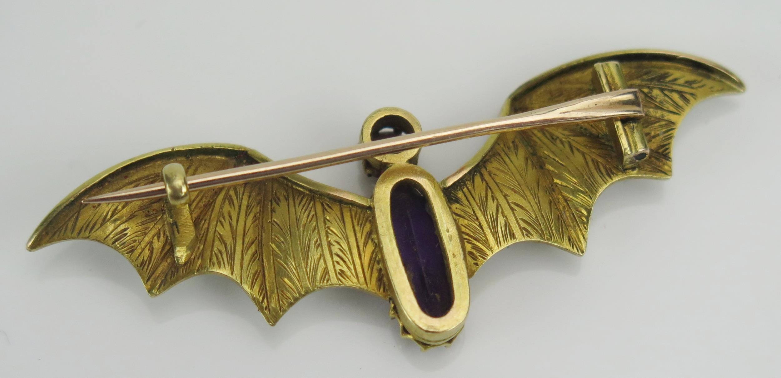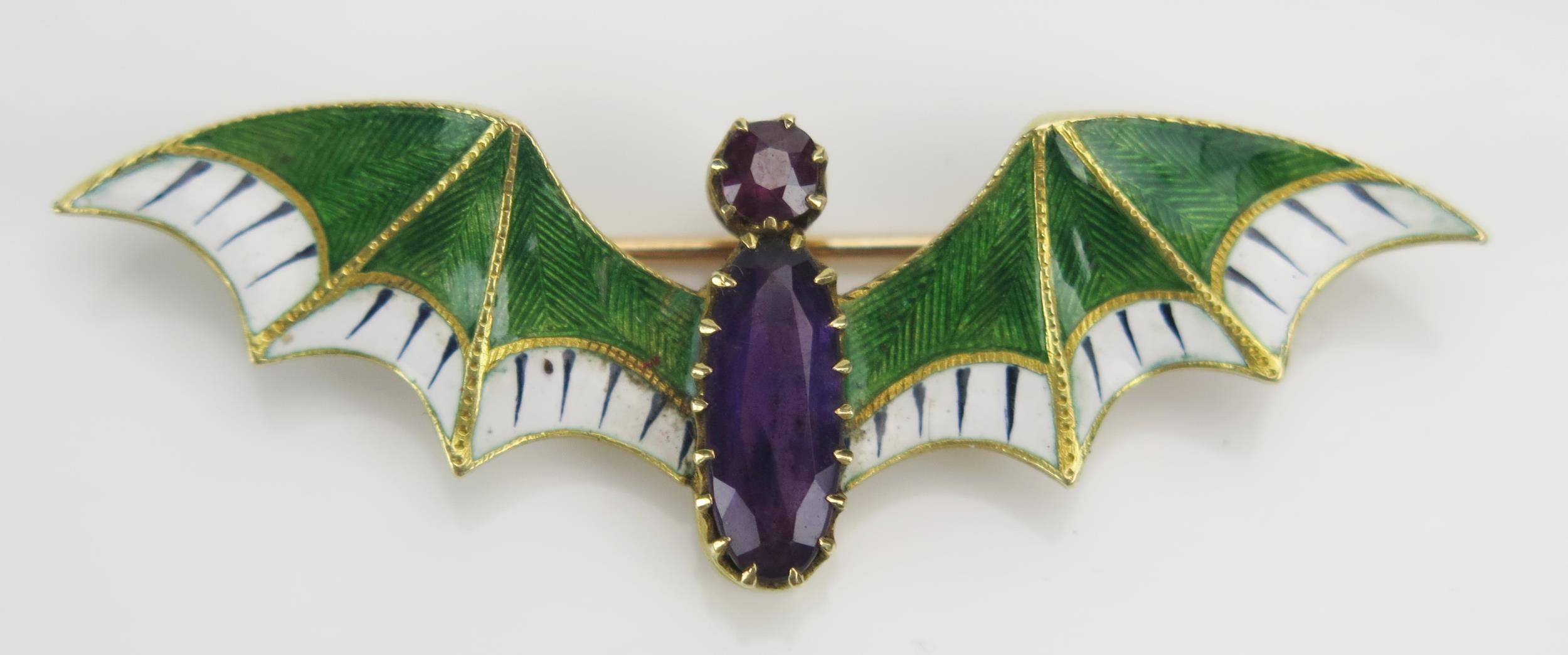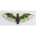 A Suffragette Bat Brooch set with an amethyst and with green and white enamel wings and a further ruby to the head in a high carat precious yellow metal setting, c. 54mm wingspan, KEE tests as 15ct, 6.84g. UNLESS OTHERWISE STATED, THE KEE TEST IS A SURFACE TEST ONLY AND IS NOT A GUARANTEE OF GOLD PURITY.