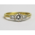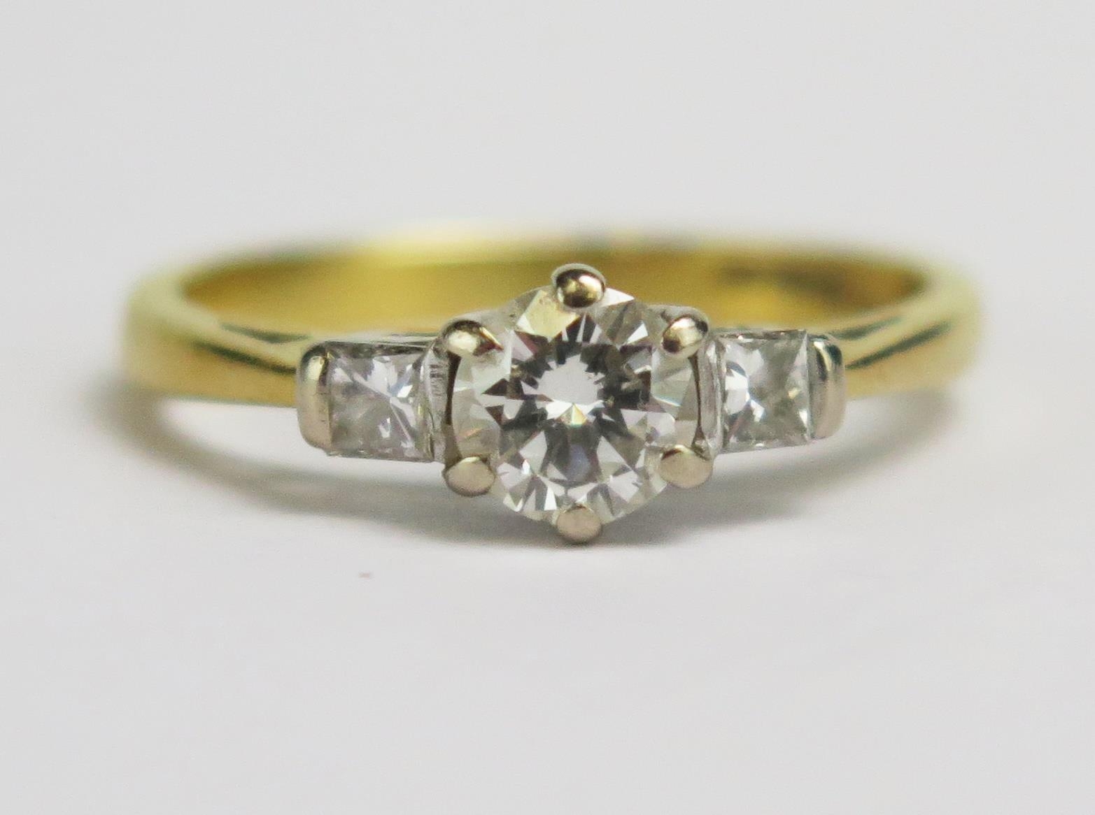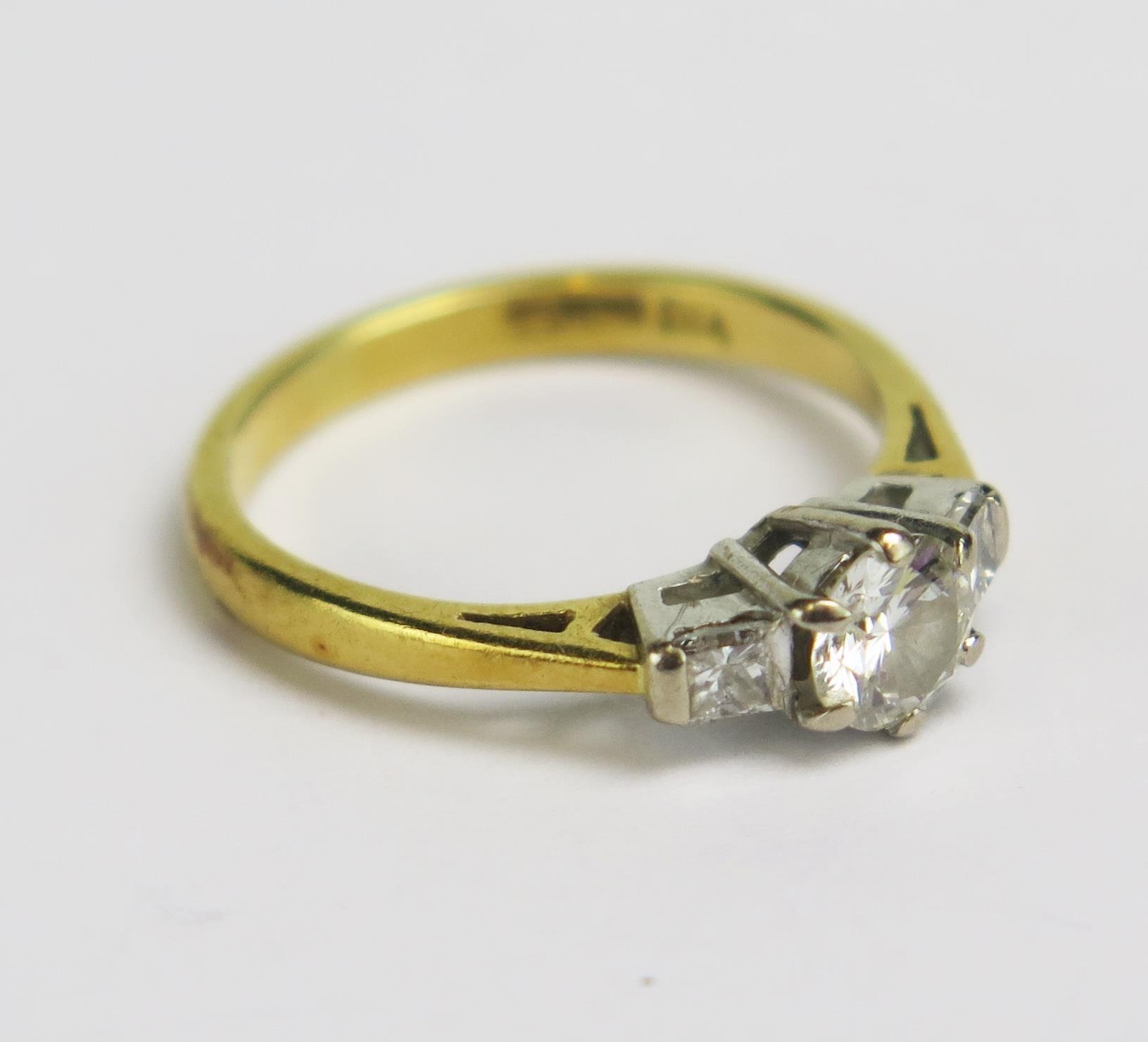 An 18ct Gold and Diamond Three Stone Ring, c. 4.8mm principal stone, size J.25, hallmarked, 2.73g.