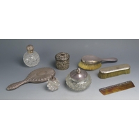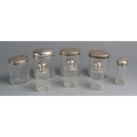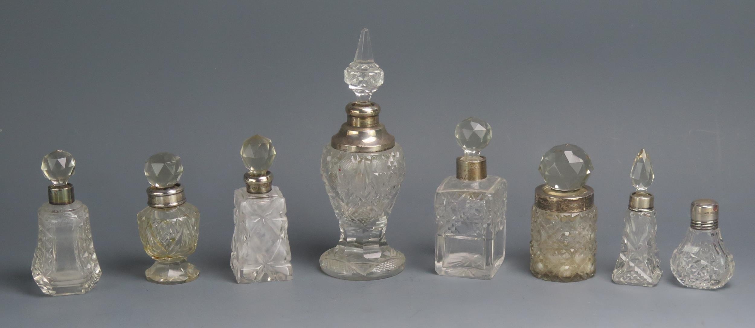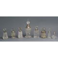 A collection of assorted clear glass and silver mounted scent bottles, various makers and dates.
