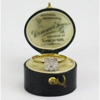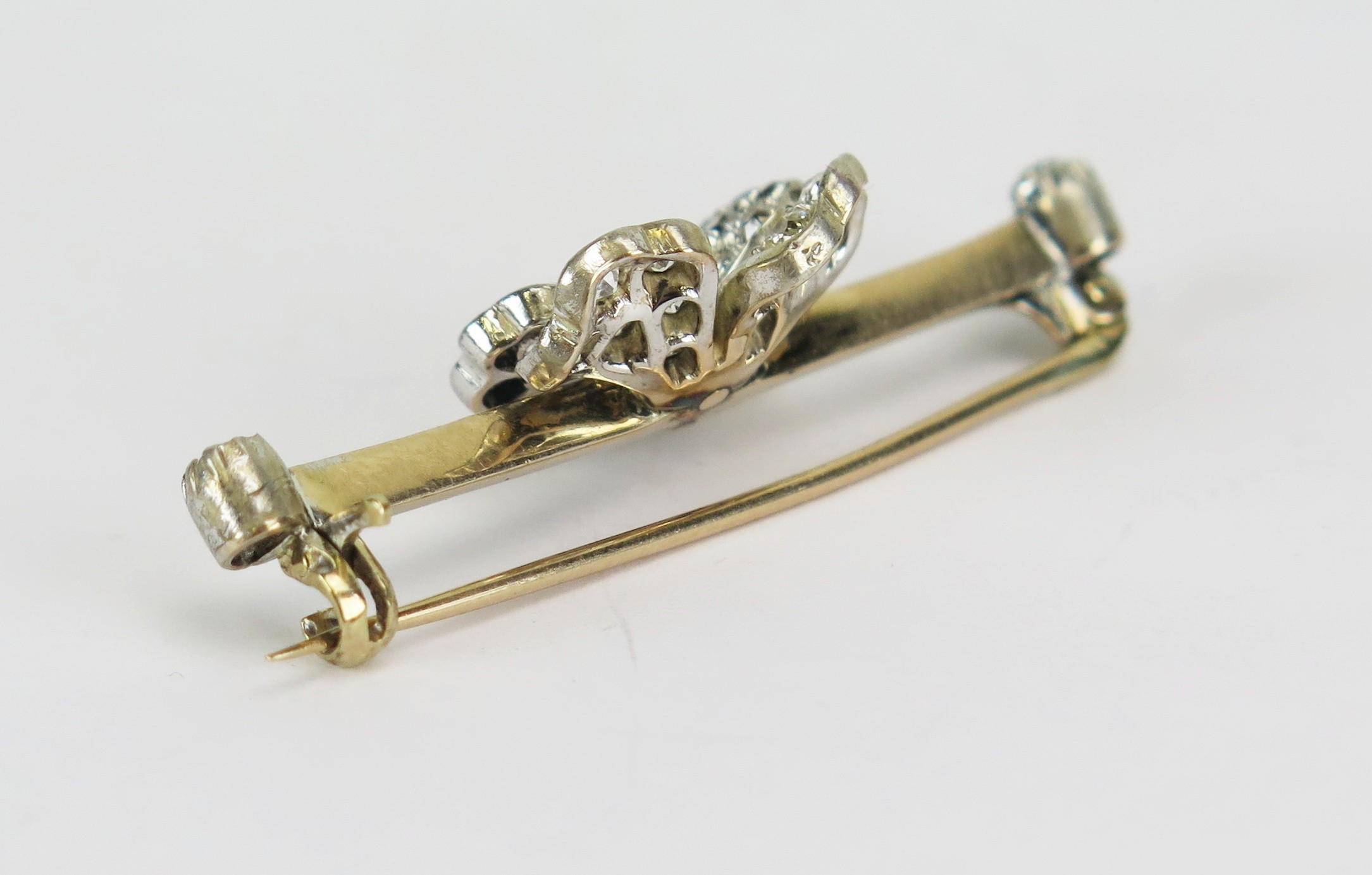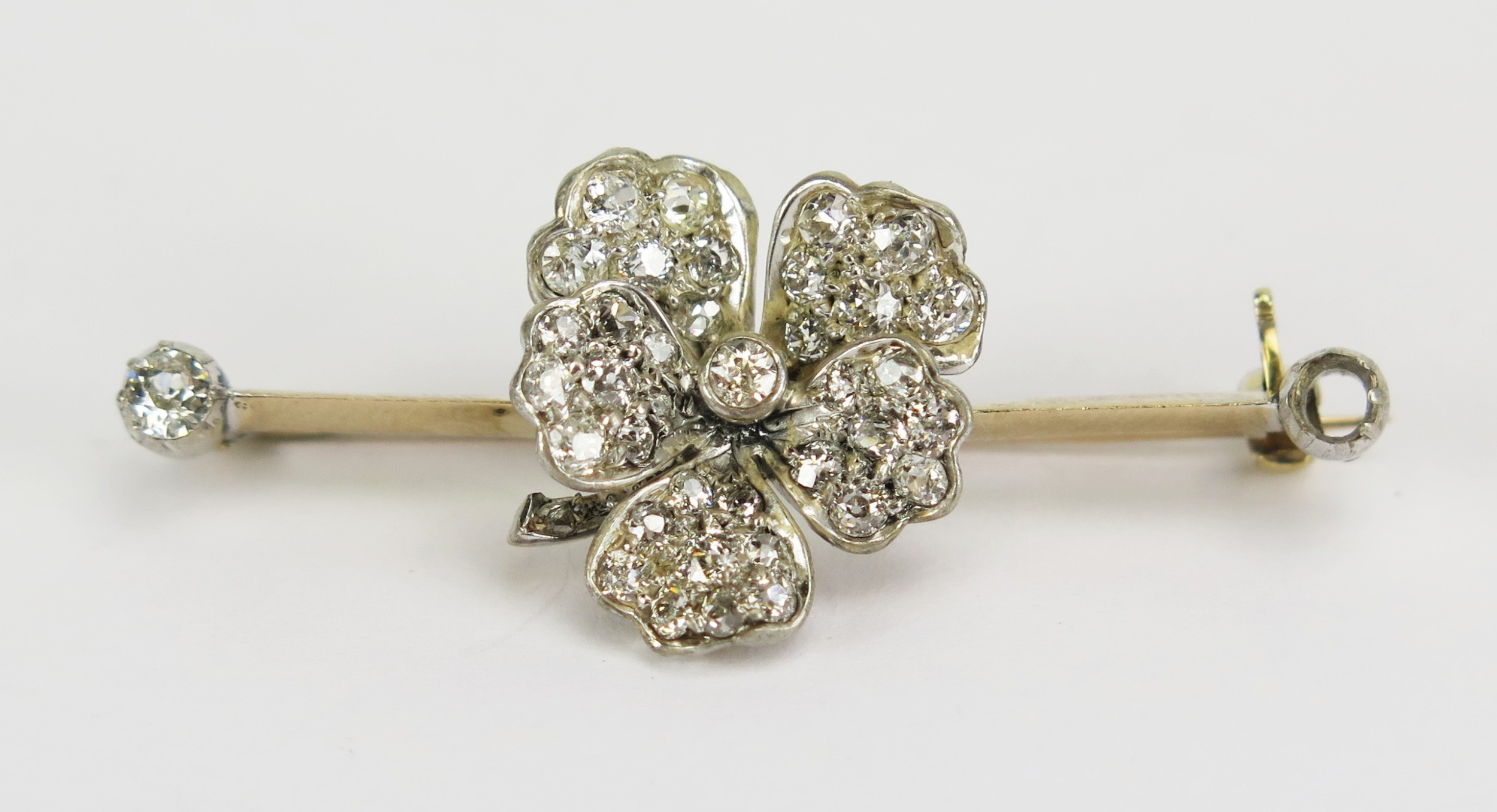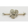 Diamond flowerhead brooch in a precious yellow and white metal setting (probably platinum), 38mm wide, KEE tests as 14 carat, 4.32g. One side stone missing. UNLESS OTHERWISE STATED, THE KEE TEST IS A SURFACE TEST ONLY AND IS NOT A GUARANTEE OF GOLD PURITY.