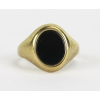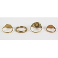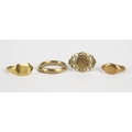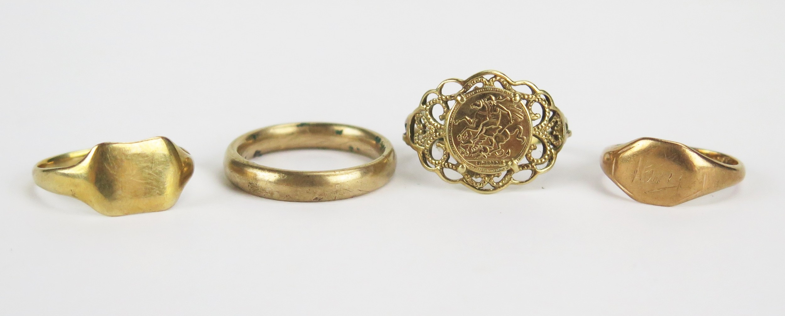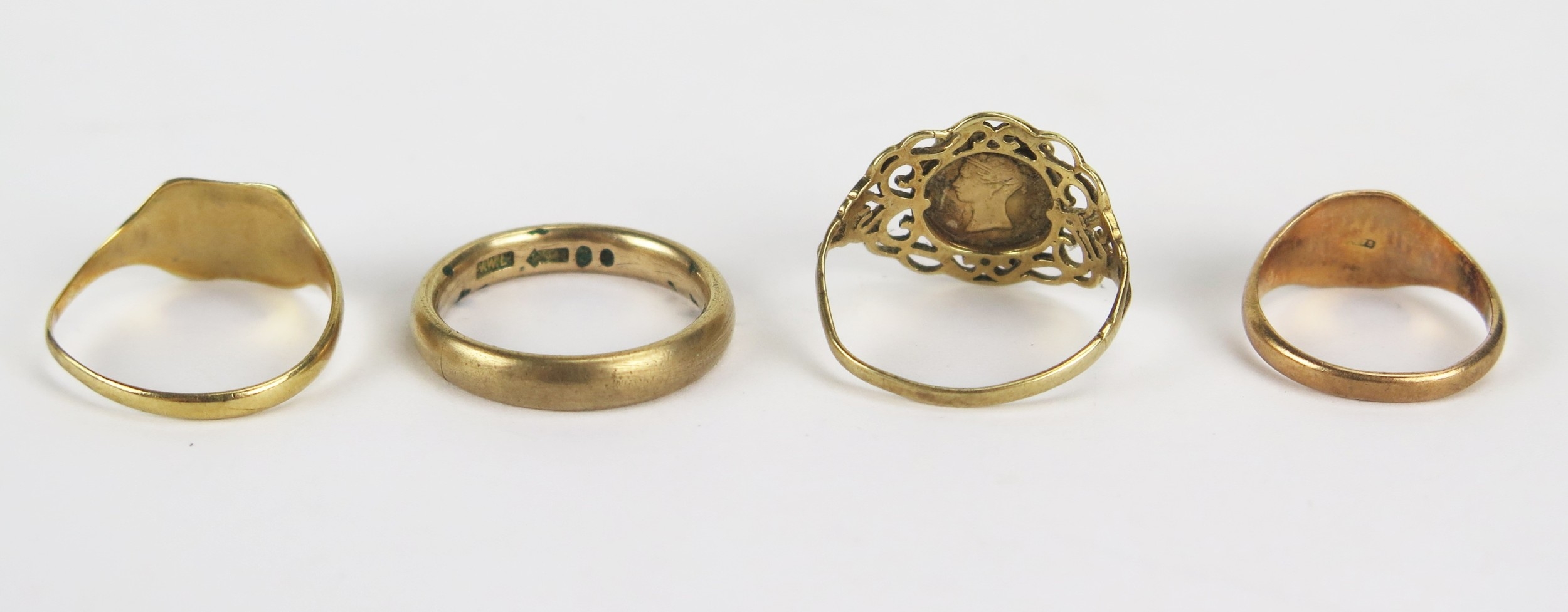 9ct Gold Wedding Band (3.6mm wide, size L.5) and two 9ct gold signet rings (sizes N and H) and a 9ct gold fantasy coin ring (shank bent), 8.35g. Wedding band cut