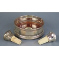 An Elizabeth II silver wine coaster, maker W I Broadway & Co, Birmingham, 2000, of traditional design, 12cm diameter and two cork and silver mounted bottle stoppers.
