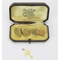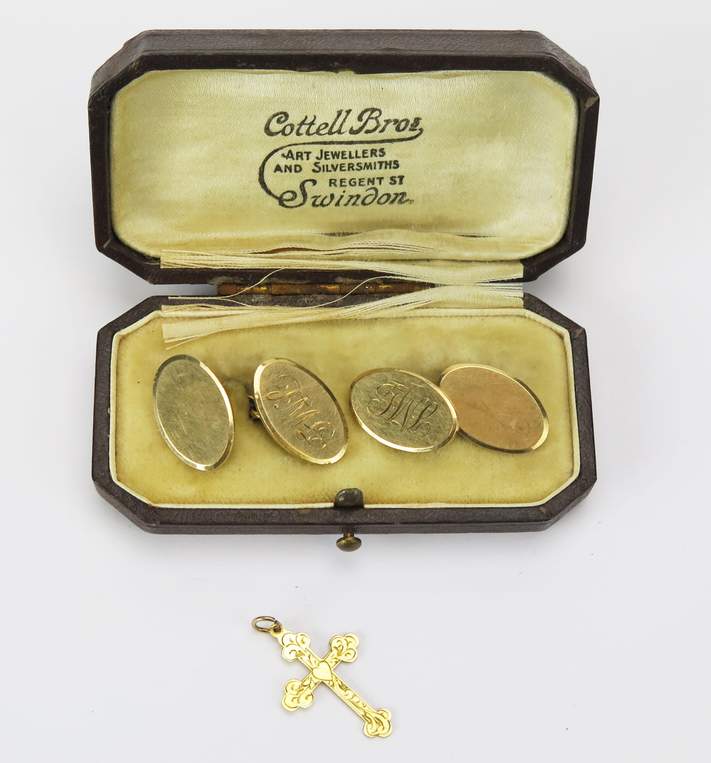 A Cased Pair of 9ct Gold Cufflinks engraved FWL (hallmarked, 14.1g) and a 9ct gold cross pendant with chased foliate scroll decoration (stamped 9CT, 0.76g)
