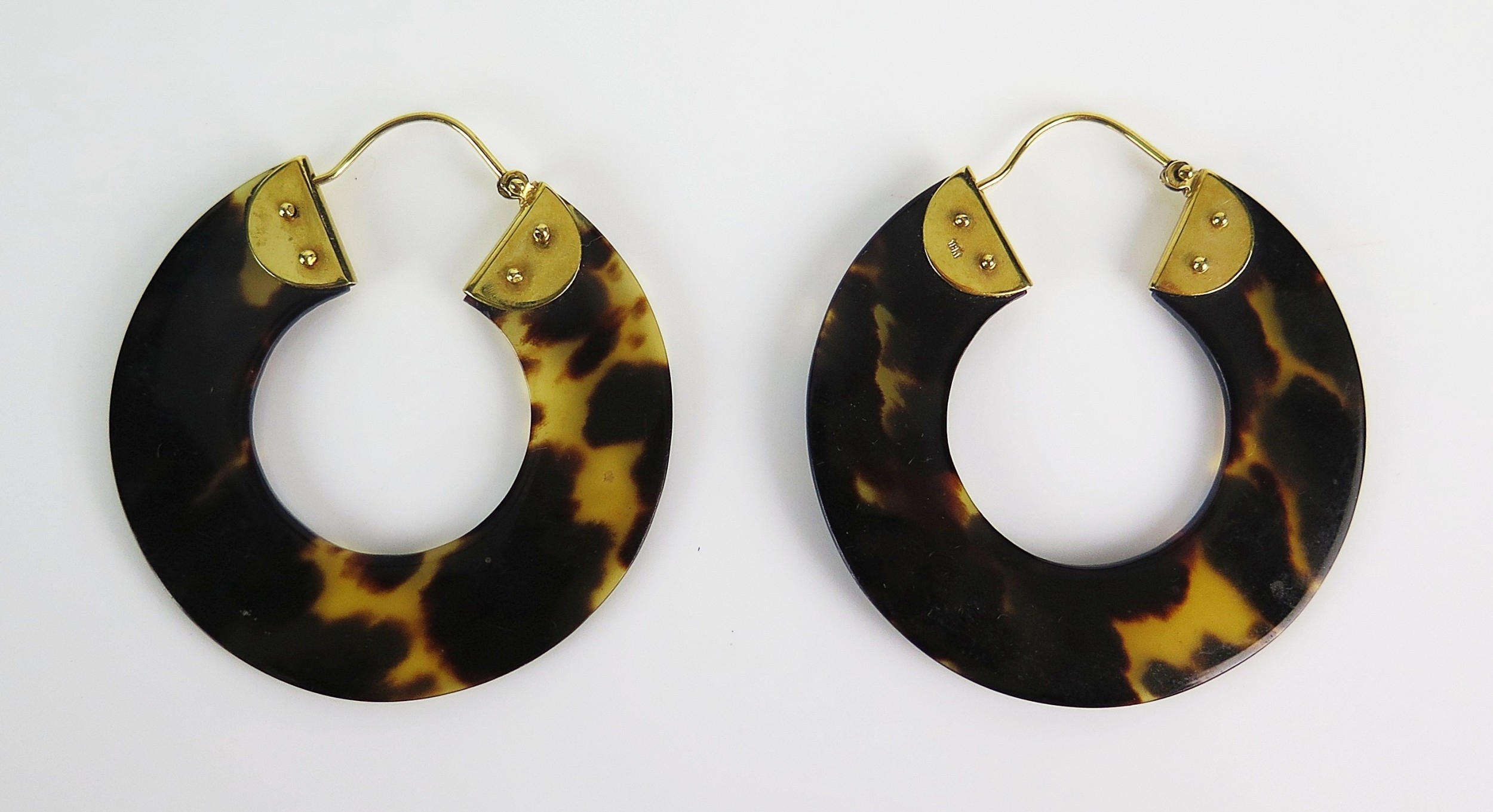 A pair of tortoiseshell hoop earrings with 18K gold fittings, 51mm diam., stamped 18Kt, 10.43g