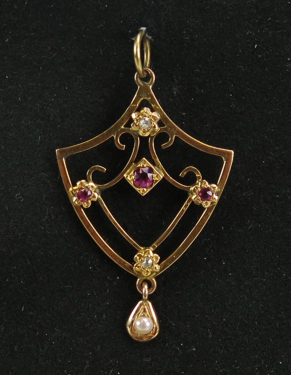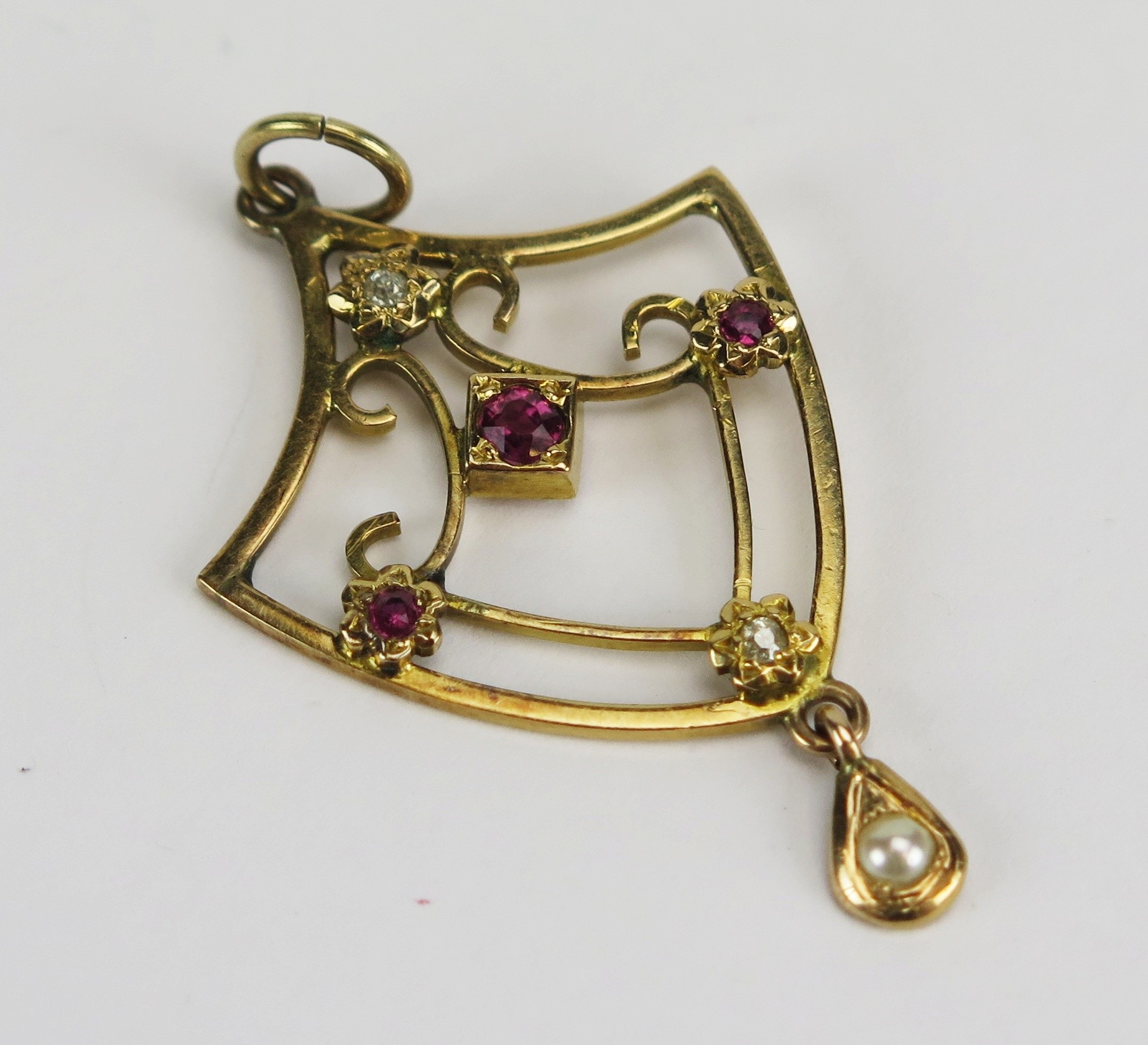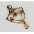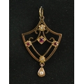 Ruby, diamond and pearl or cultured pearl pendant in a precious yellow metal setting, 47mm drop, KEE tests as 14 carat, 3.56g. UNLESS OTHERWISE STATED, THE KEE TEST IS A SURFACE TEST ONLY AND IS NOT A GUARANTEE OF GOLD PURITY.