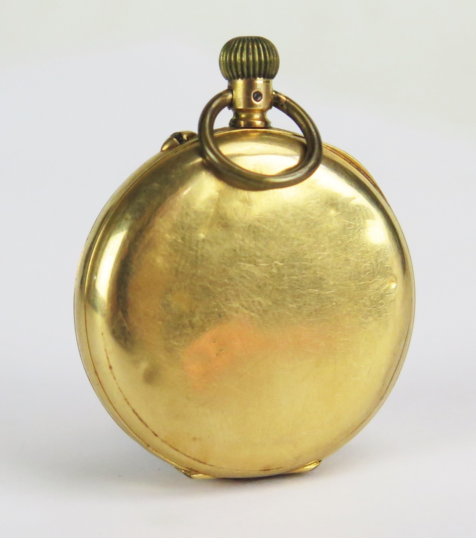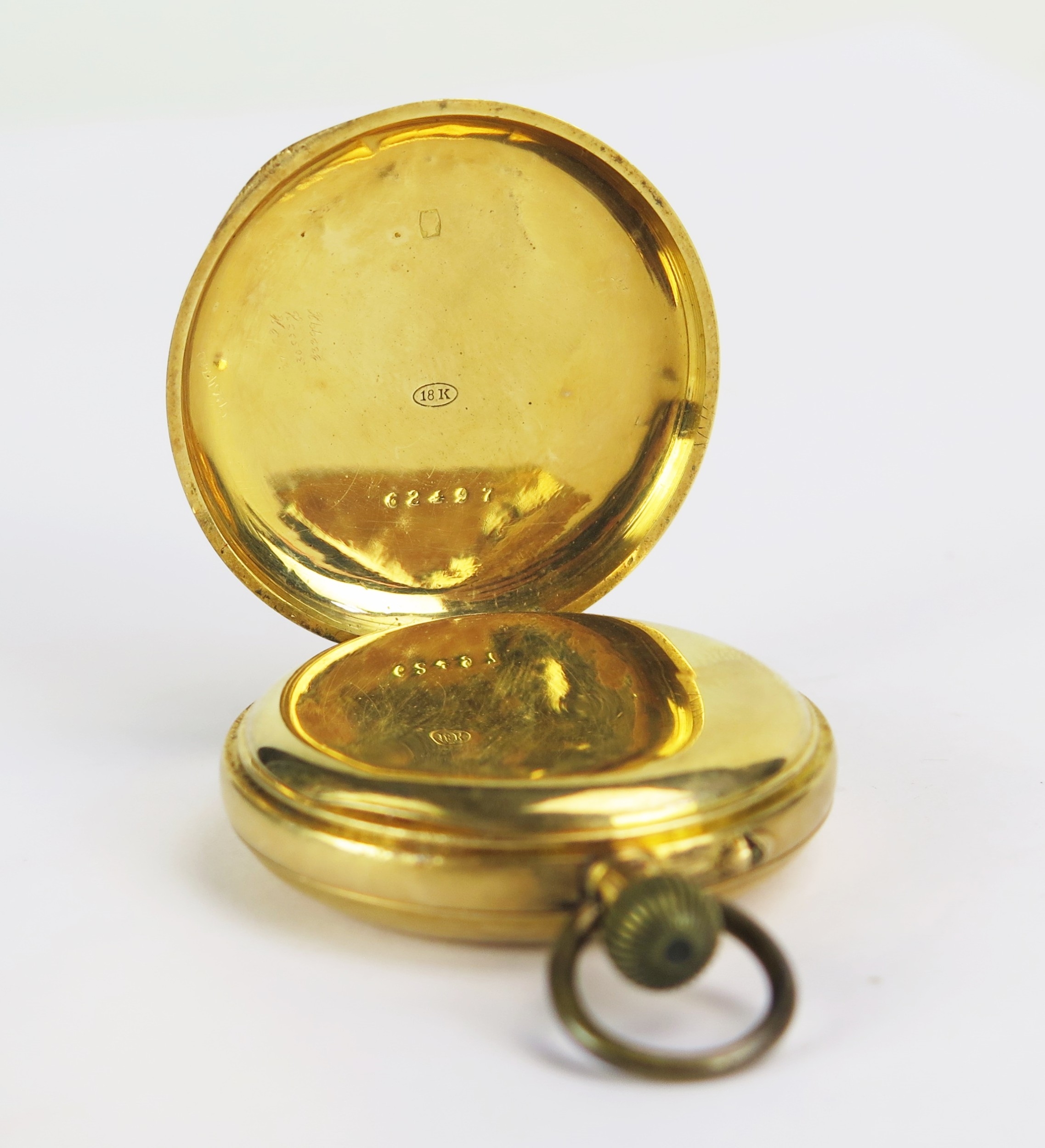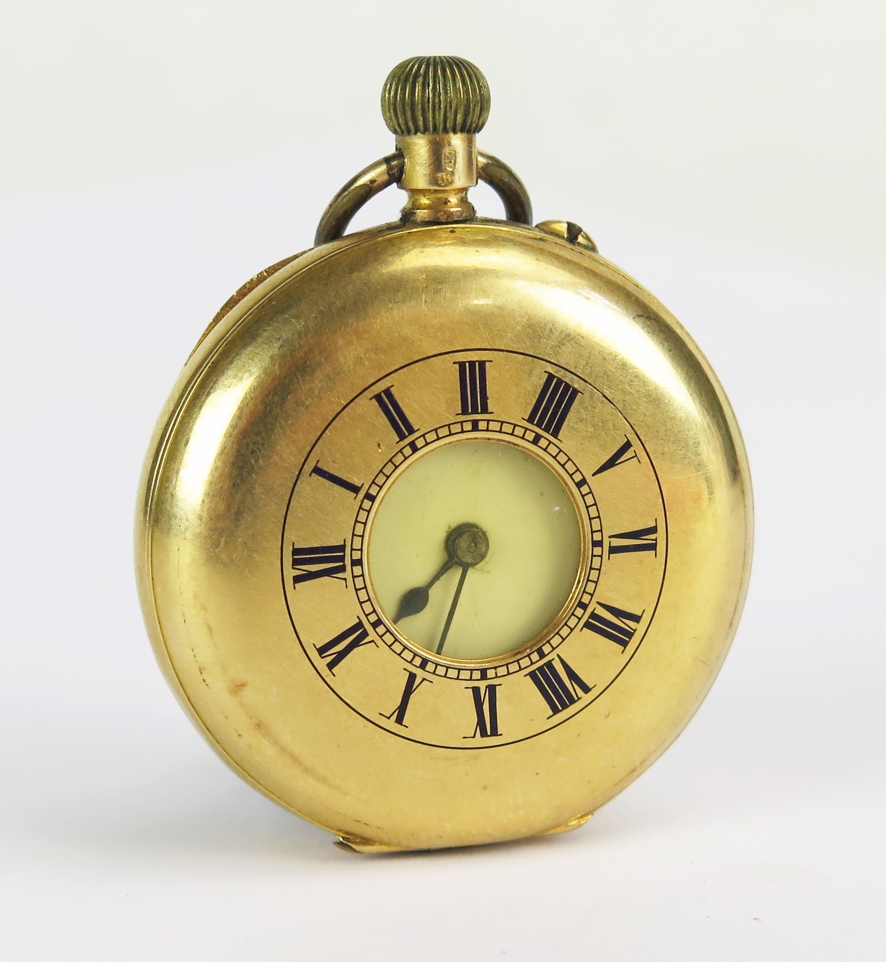 18K Gold Lady's Half Hunter Fob Watch, the 35.9mm case with Swiss marks to the inner back and dust cover, 41.77g gross. Does not wind or run