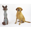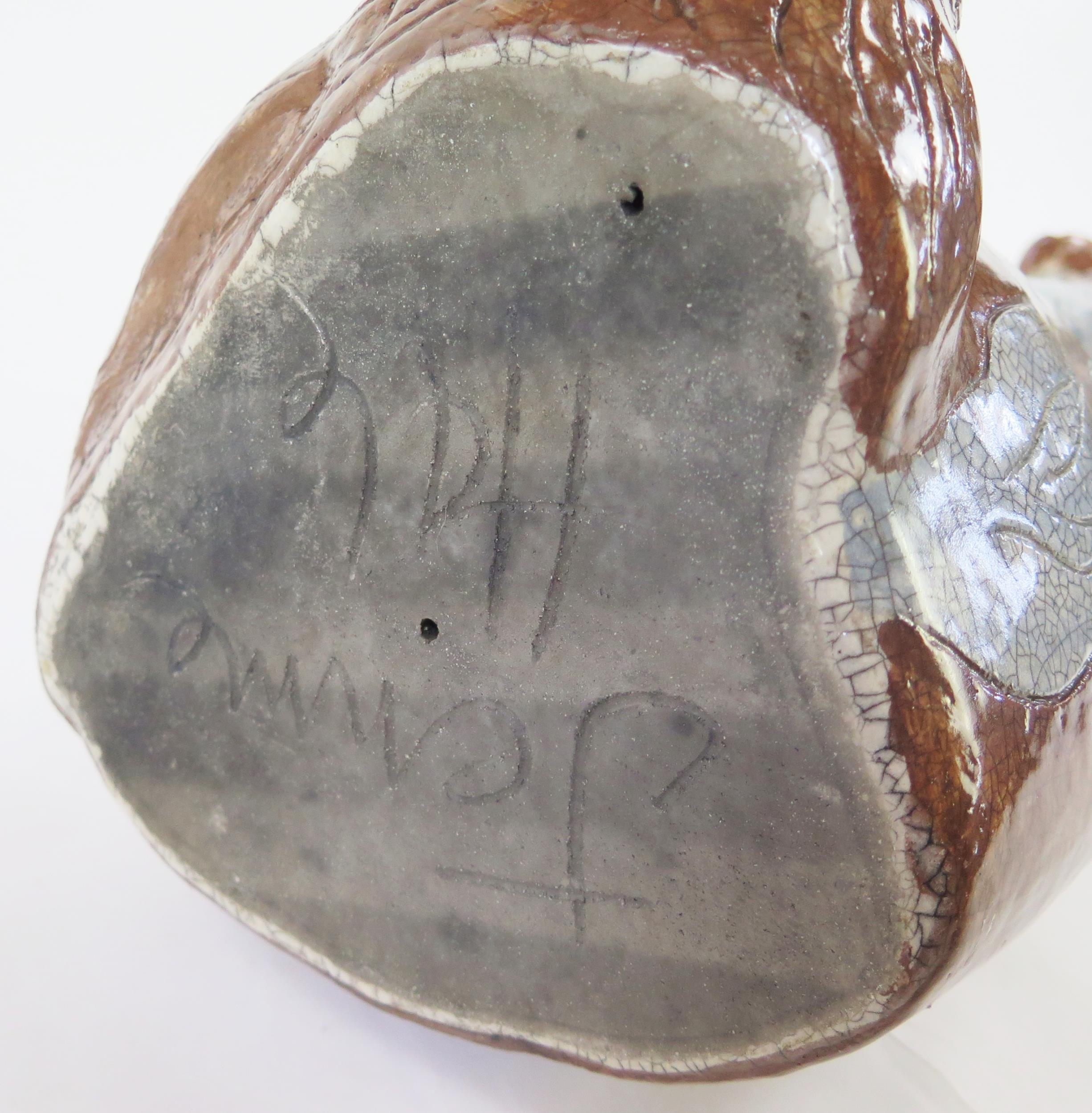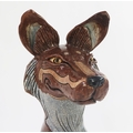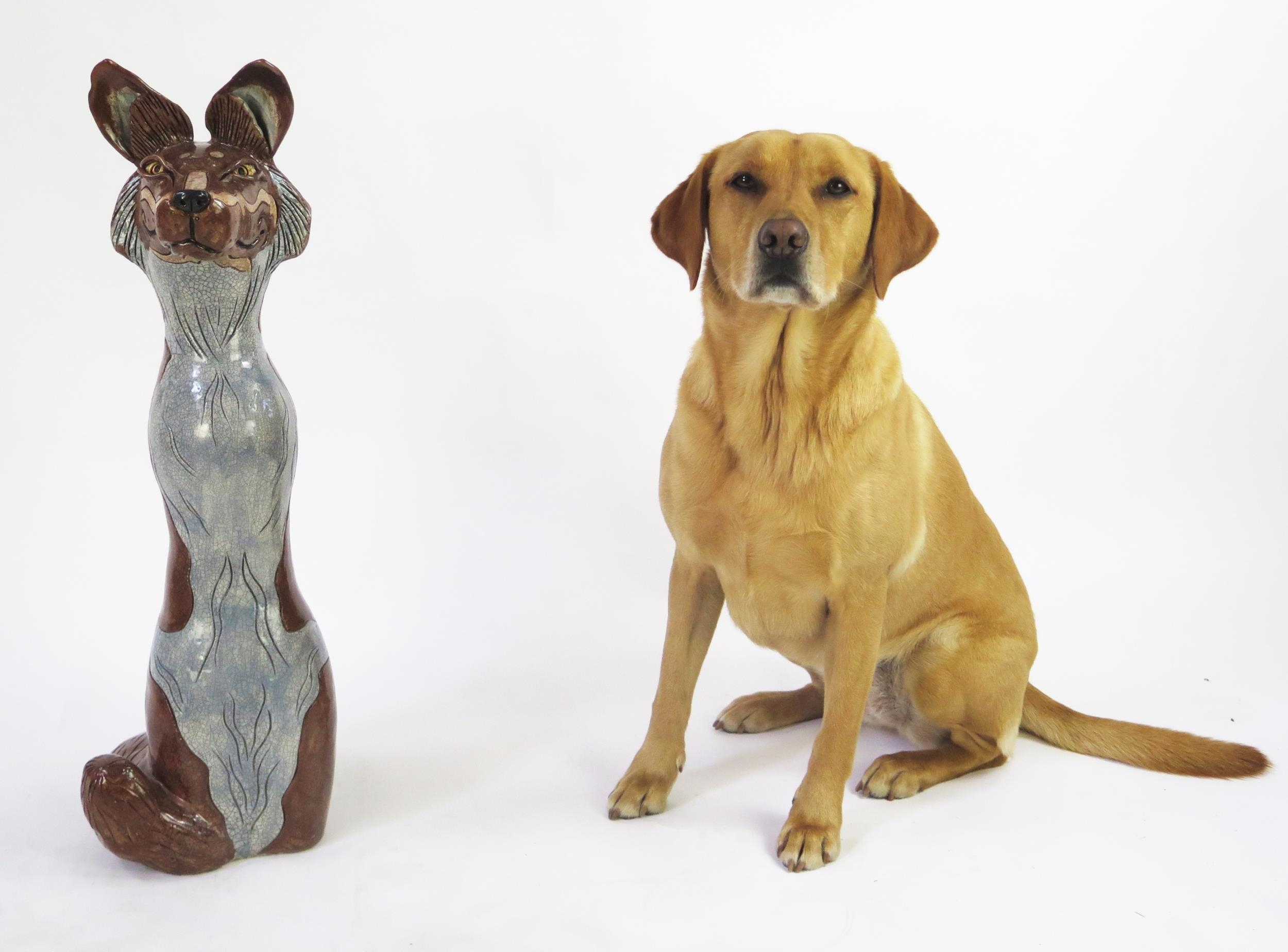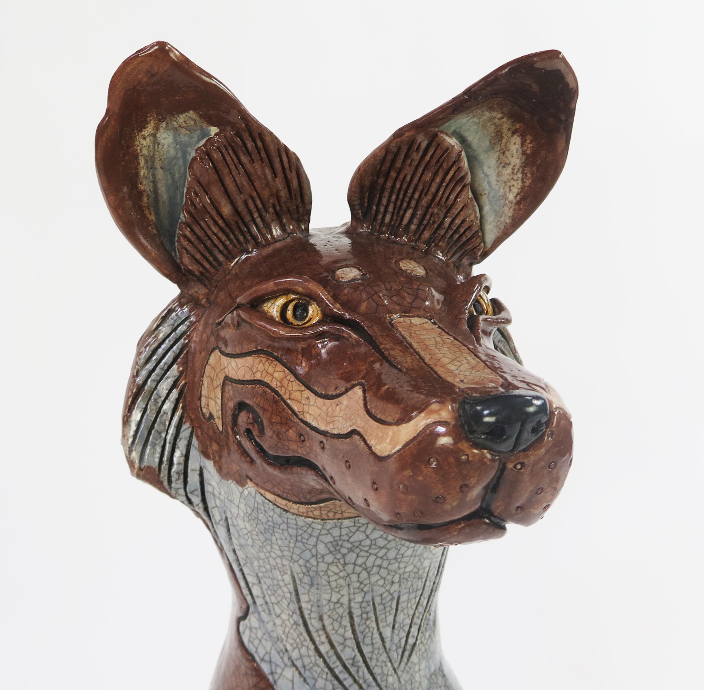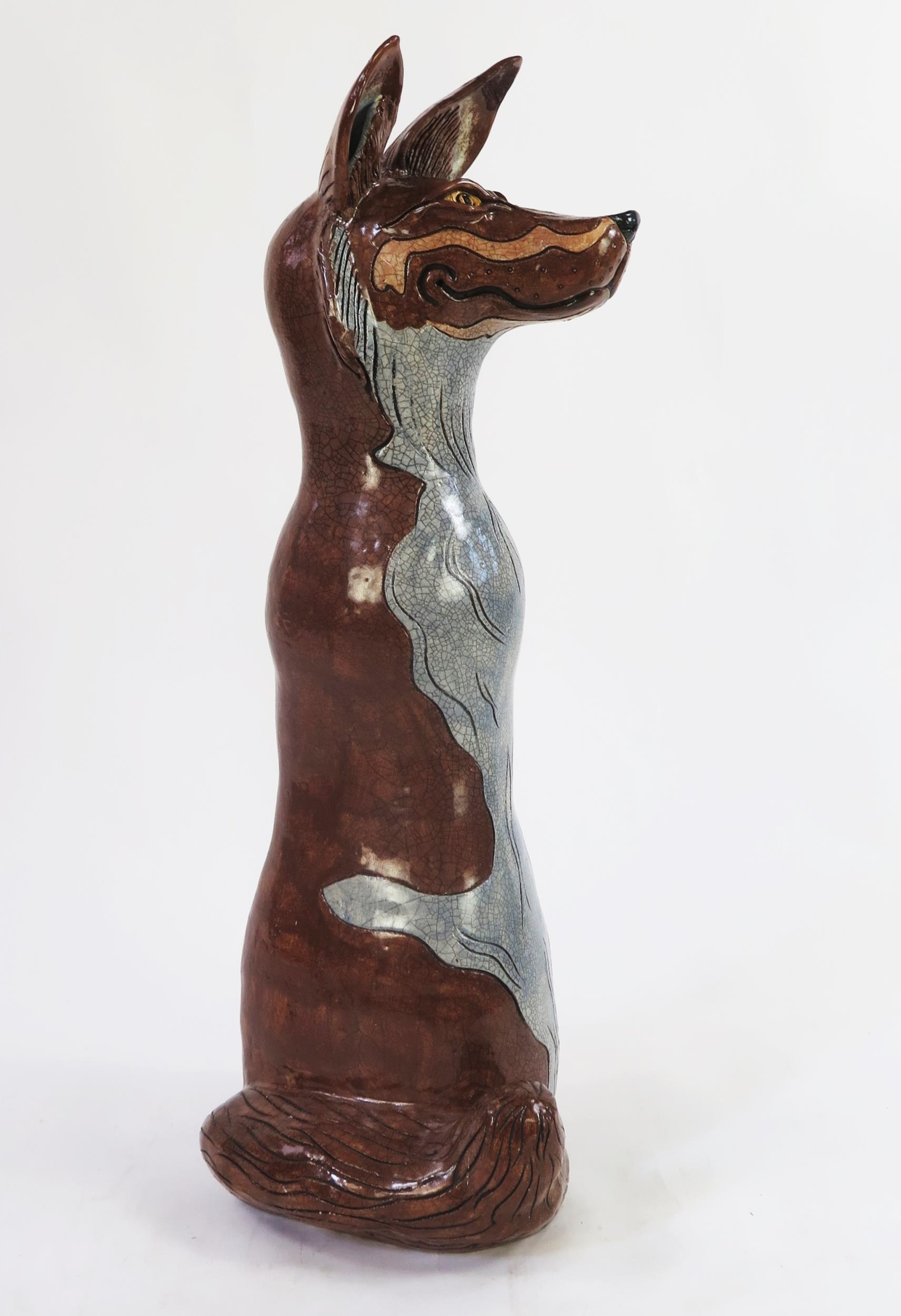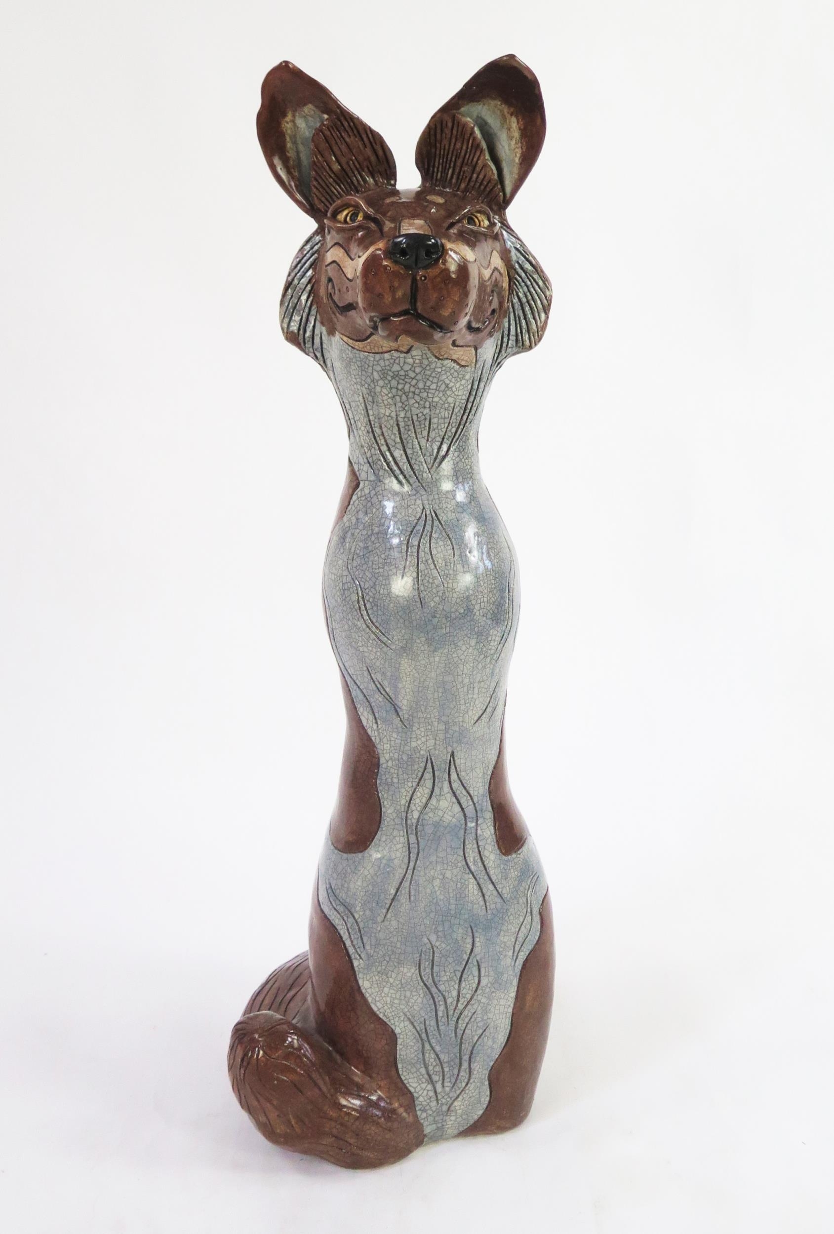 Jennie Hale (British 1956-) a large raku fired studio pottery sculpture of a seated wolf, signed to base, 74cm high. (right ear tip re-glued) (dog not included!)