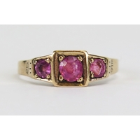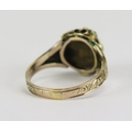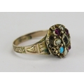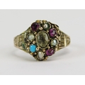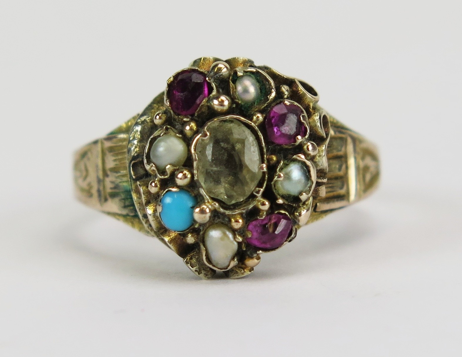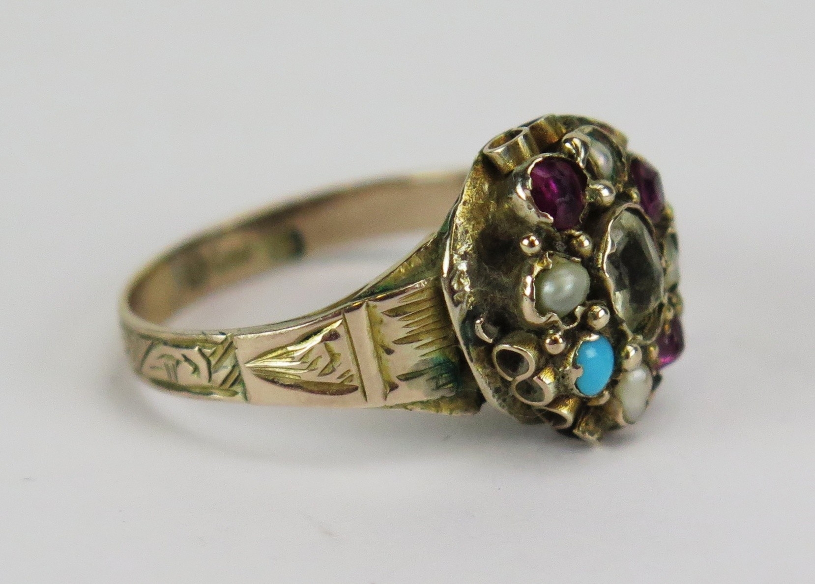 Victorian 15ct gold ruby, seed pearl, turquoise and paste ring with a foliate scroll chased shank, size J, 2.29g. Faults